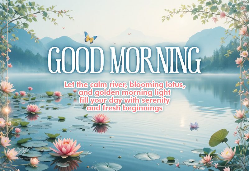 Good Morning Wishes with a Lotus Lake and Fresh Beginnings