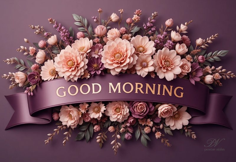 Begin the day with beauty and grace through this elegant Good Morning greeting card featuring delicate flowers and a refined purple ribbon banner. The soft floral styling and rich lavender tones create a warm and polished image for sharing lovely morning wishes.