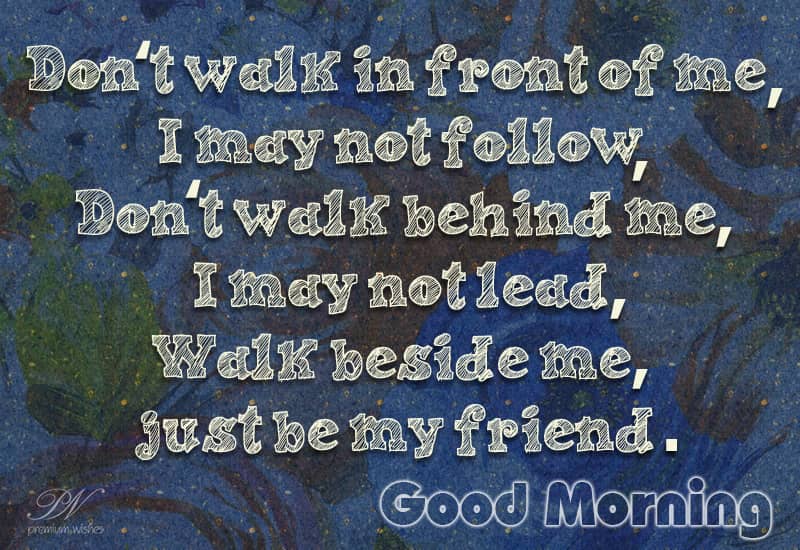 Don’t walk in front of me, I may not follow. Don’t walk behind me, I may not lead. Walk beside me, just be my friend. Good Morning
