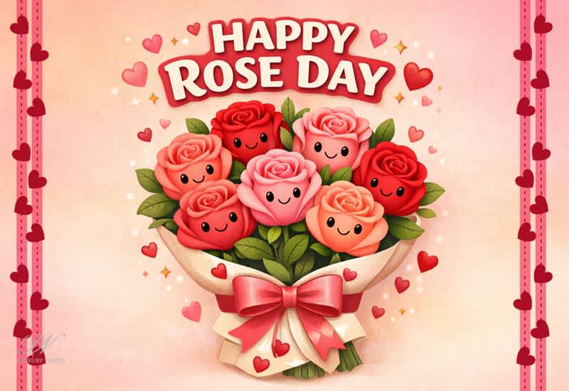 This adorable Happy Rose Day greeting card featuring a cheerful bouquet of smiling roses adds a playful and loving touch to your wishes. It’s perfect for sharing with your partner, friends, or anyone who brings happiness into your life.