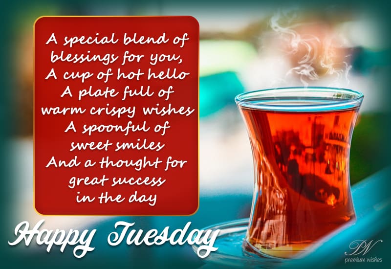 Special blend of blessings for you – Happy Tuesday – a cup of hot hello – a plate full of warm crispy wishes – a spoonful of sweet smiles and a thought for great success in the day
